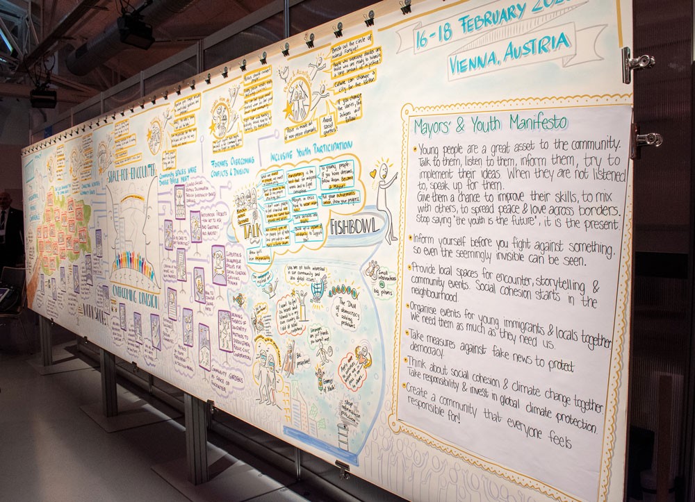 Neben vielen anderen Aktivitäten wurde eine Konferenz initiiert, die vor allem für ausgewählte Bürgermeister*innen betroffener Länder, Vertreter*innen offizieller Stellen, NGOs und Medien eine Plattform des Austauschs und der Vernetzung bilden sollte. Mit Hilfe der ÖBB wurde eine Halle gefunden, die diesem Austausch Raum gab. Diese, nach wie vor in Betrieb stehende Industriehalle, wurde das Ambiente für dieses ungewöhnliche Veranstaltungsformat.