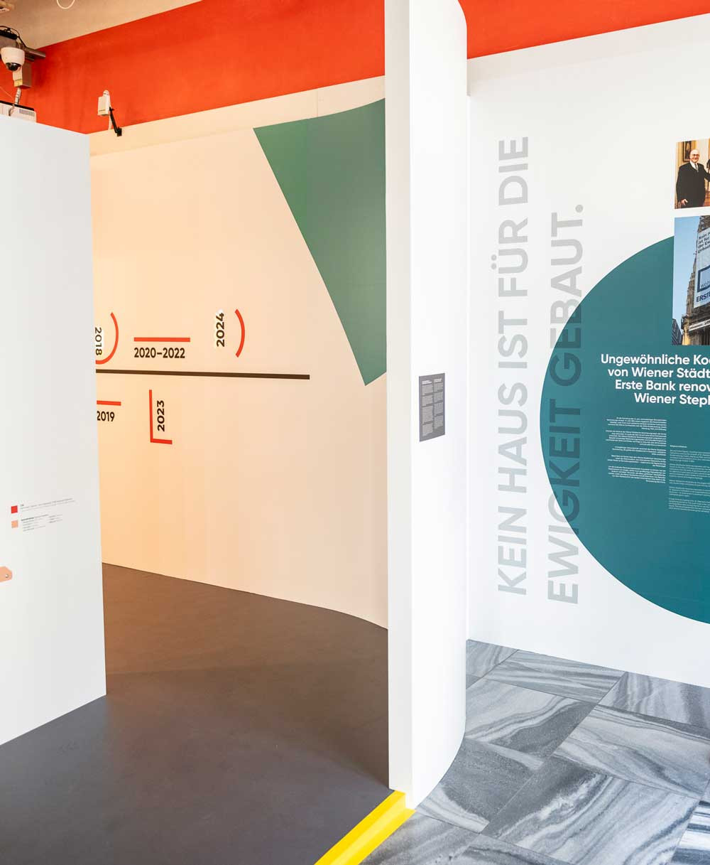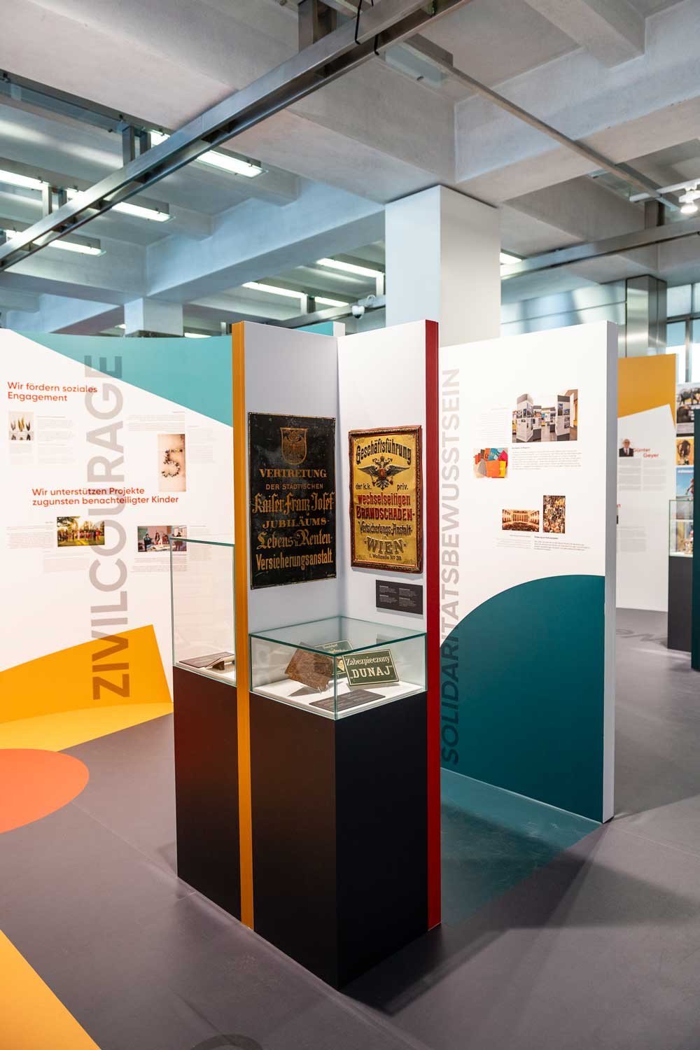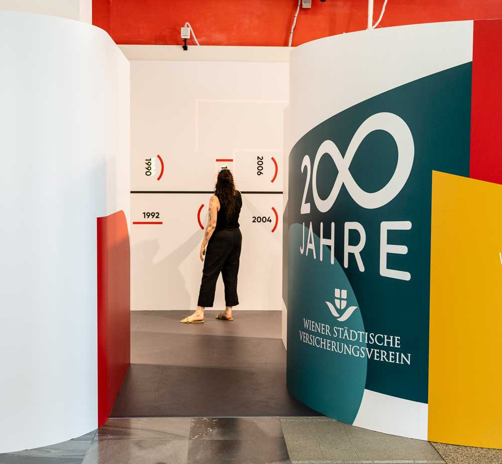 Zum 200-jährigen Jubiläum des Wiener Städtischen Versicherungsvereins entwickelten wir, auf einer Fläche von 50 m², eine temporäre Architektur für die Jubiläumsausstellung im Foyer des Ringturms. Das von uns entwickelte Design griff sowohl die Geschichte als auch die Zukunftsperspektiven des Unternehmens auf.