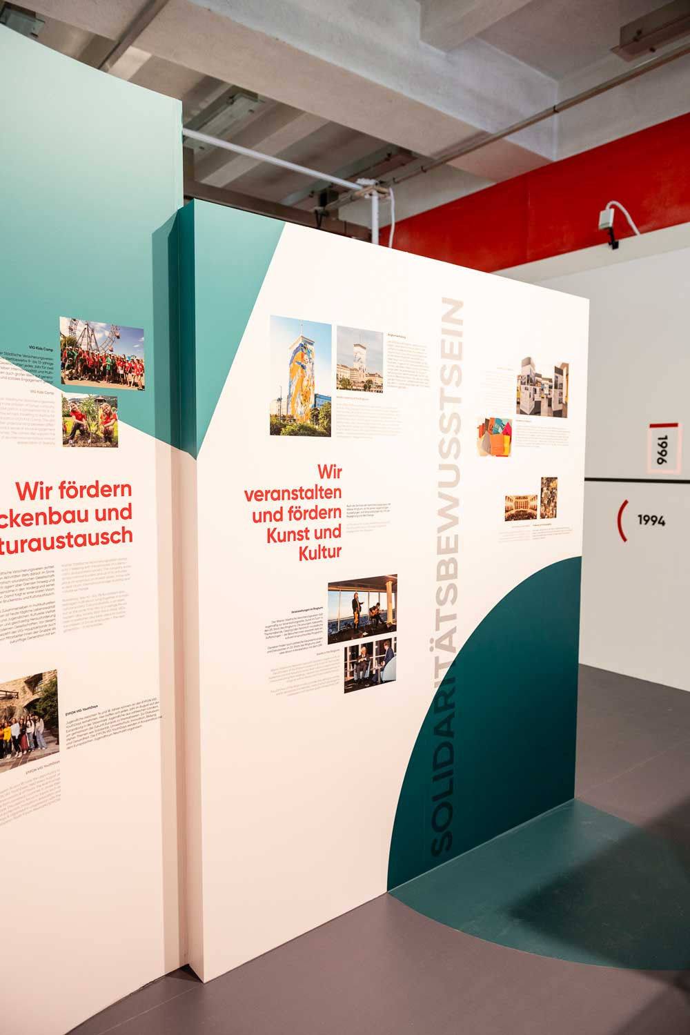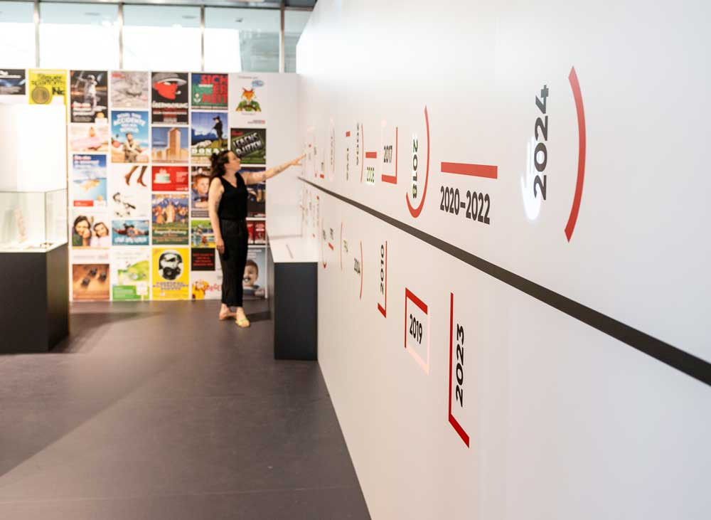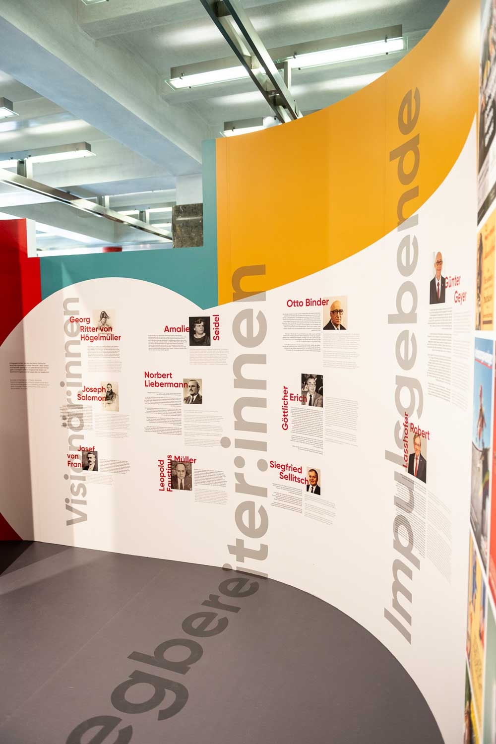 Die Architektur und die Ausstellungselemente schafften eine eindrucksvolle Verbindung von Vergangenheit und Zukunft, wobei das Design nicht nur als Präsentationsfläche diente, sondern auch als Ausdruck der kontinuierlichen Weiterentwicklung und Visionen des Unternehmens. Die Ausstellung wurde so konzipiert, dass sie die Besucher·innen sowohl visuell als auch emotional anspricht und einen bleibenden Eindruck hinterlässt.