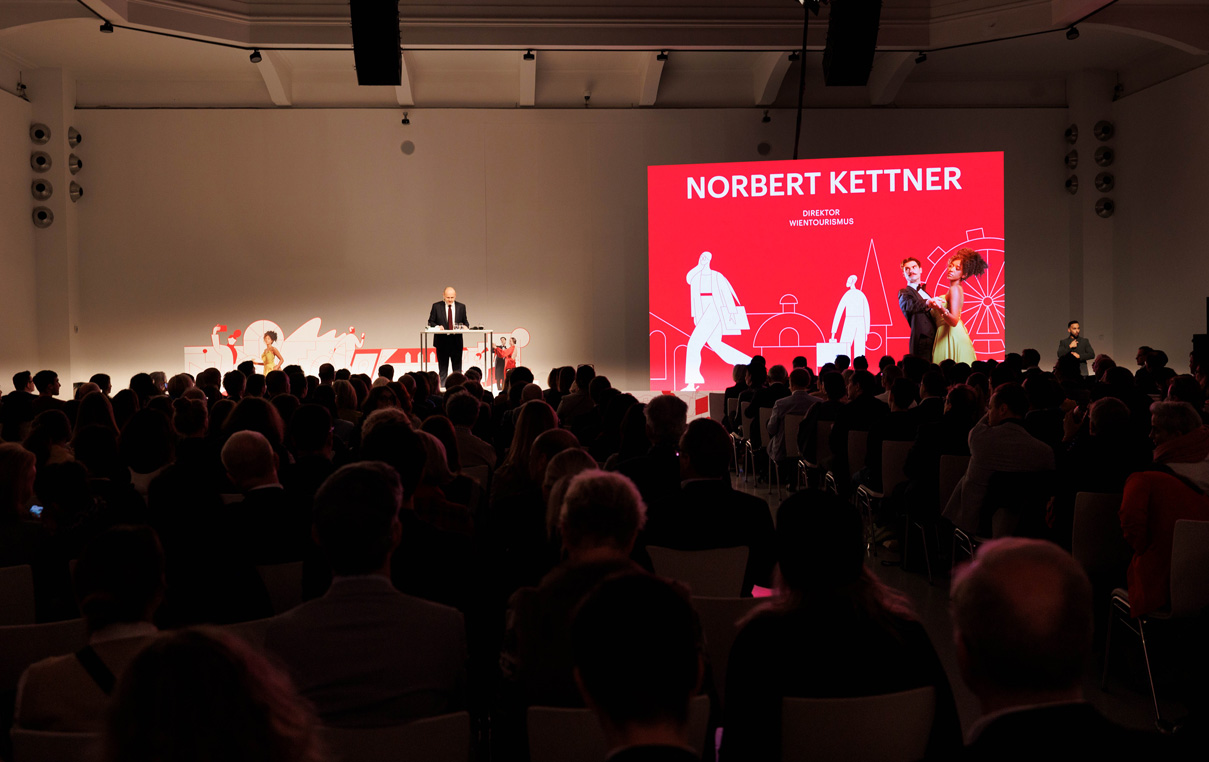 Für die Konferenz im MAK entwickelten wir eine neue Stage Identity, die auf der bestehenden Corporate Identity des Wien Tourismus basiert. Ziel war es, eine Bühne mit klarer Wiedererkennbarkeit zu schaffen – modular, markentypisch und für zukünftige Veranstaltungen adaptierbar. Gestaltung, Materialität und Medieneinsatz fügten sich zu einem stimmigen Markenbild, das Orientierung und Präsenz schafft.