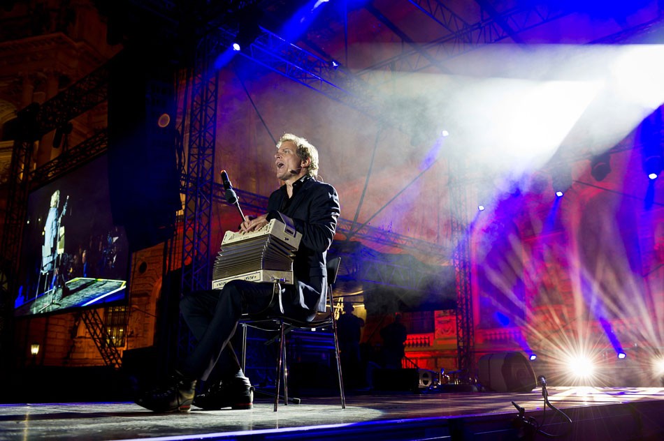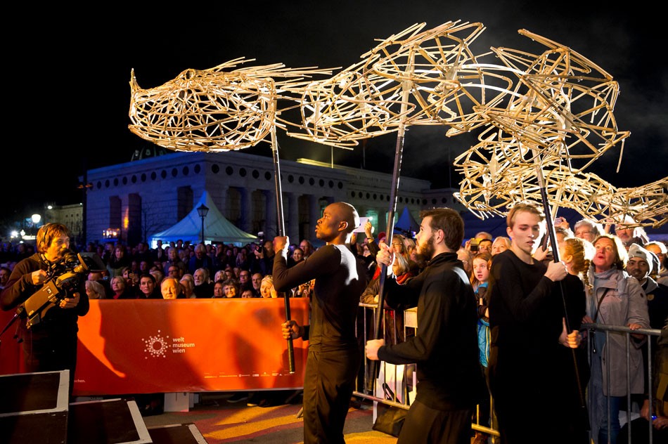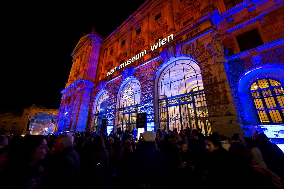 Bei der von André Heller kuratierten Show fanden sich rund 7.500 Personen am Heldenplatz ein, um mit Künstler*innen aus der ganzen Welt ein Eröffnungsfest der besonderen Art zu feiern. Die transparente Bühne fügte sich in Kombination mit dem maßgeschneiderten Lichtkonzept ideal in die Fassade des Weltmuseums ein und ermöglichte den fast 60 Künstler*innen die perfekte Fläche, um die Pforten des Weltmuseums mit einer zweistündigen Show zu öffnen.