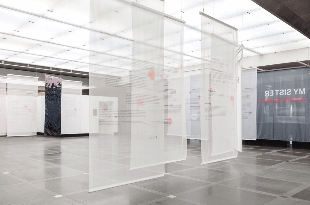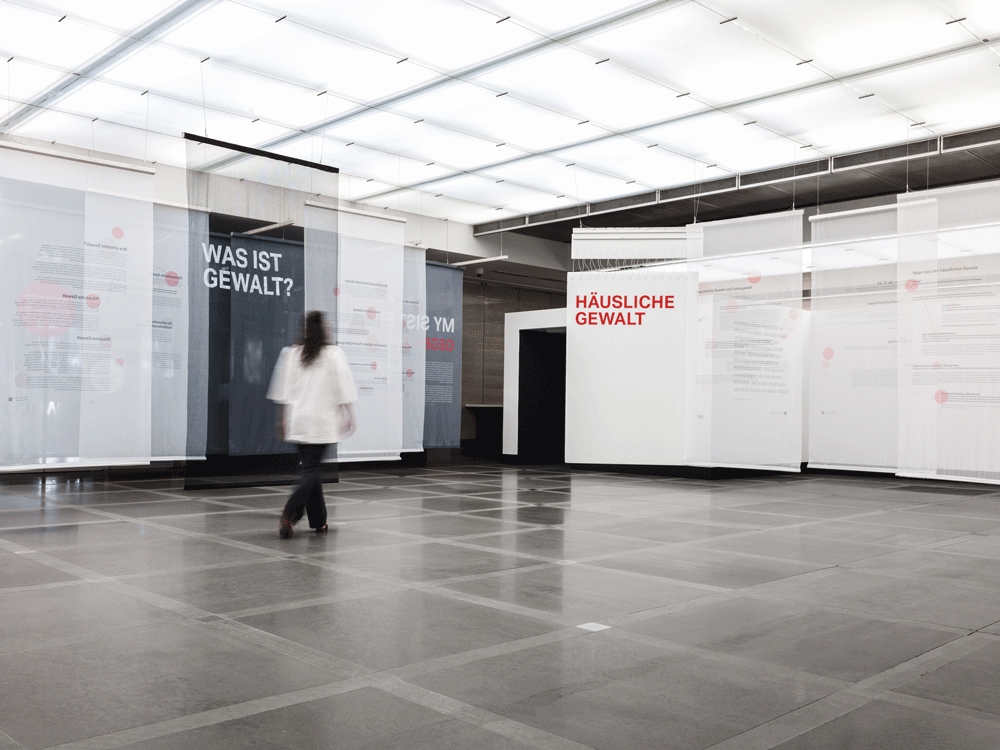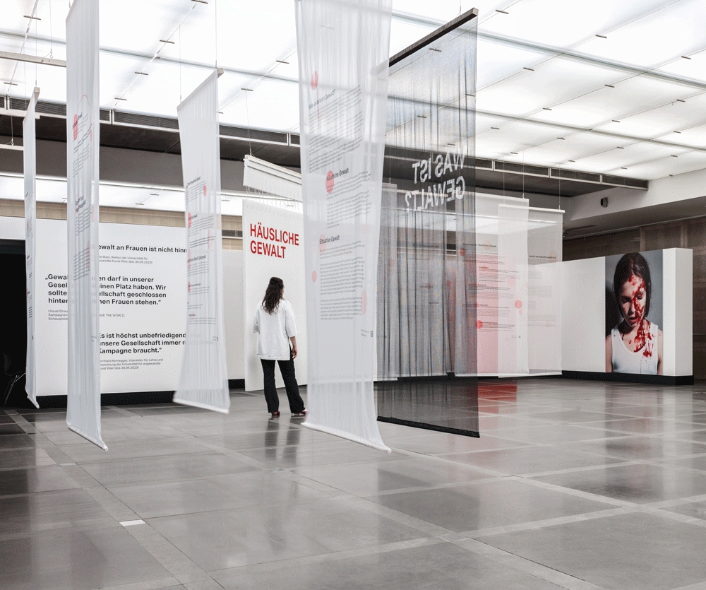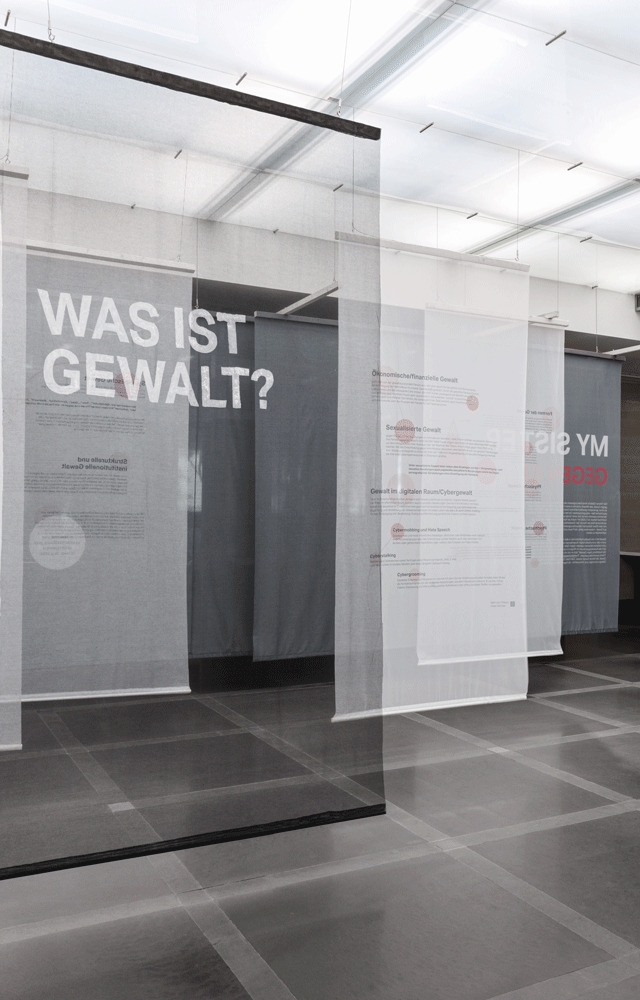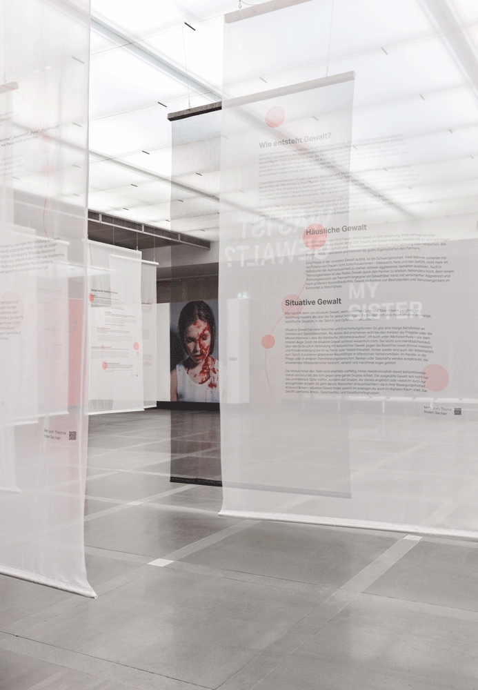 The core of our design concept were semi-transparent panels of fabric that allowed for some transparency, but at the same time symbolically covered up the issue of violence against women. These lengths of delicate fabric were contrasted by complementary fabrics, which, through their different textures, created a demarcation between the individual areas and had a strong presence in the space as a representative of the different facets of violence. As the center of the exhibition, we deliberately chose an empty space that on the one hand could be used as venue for the events accompanying the exhibition, and on the other hand offered a 360-view of the range of violence against women.